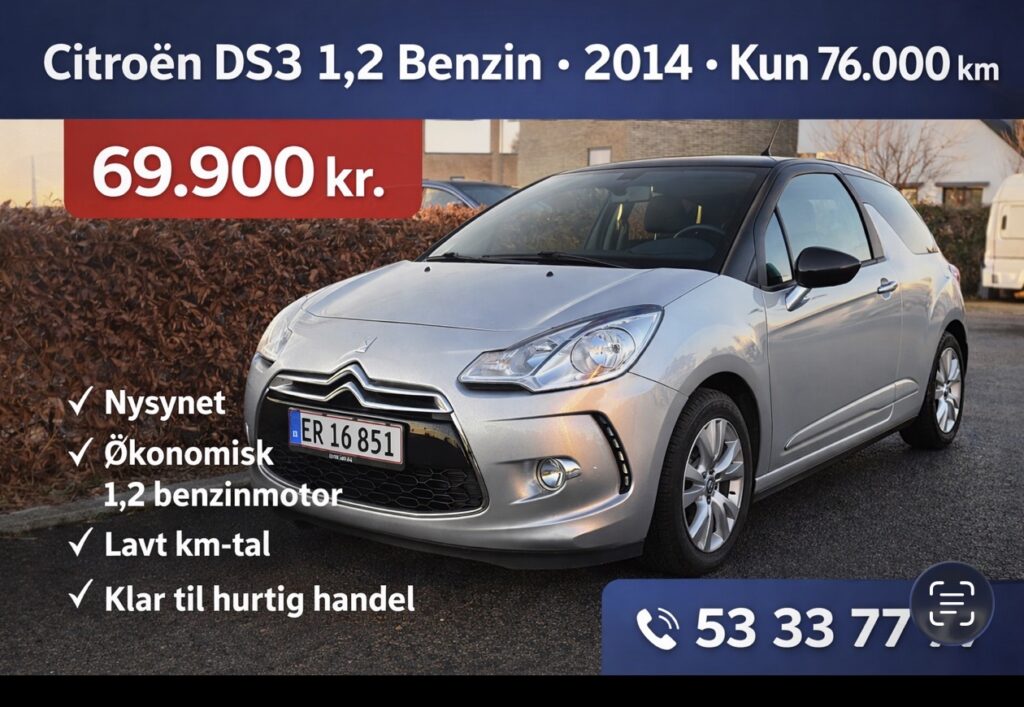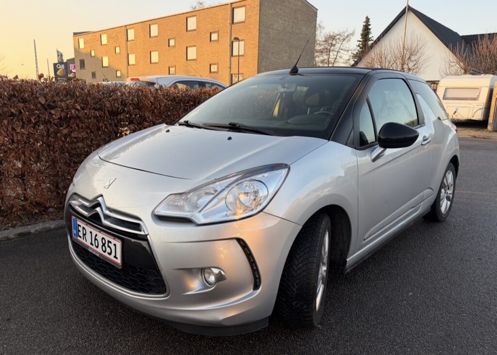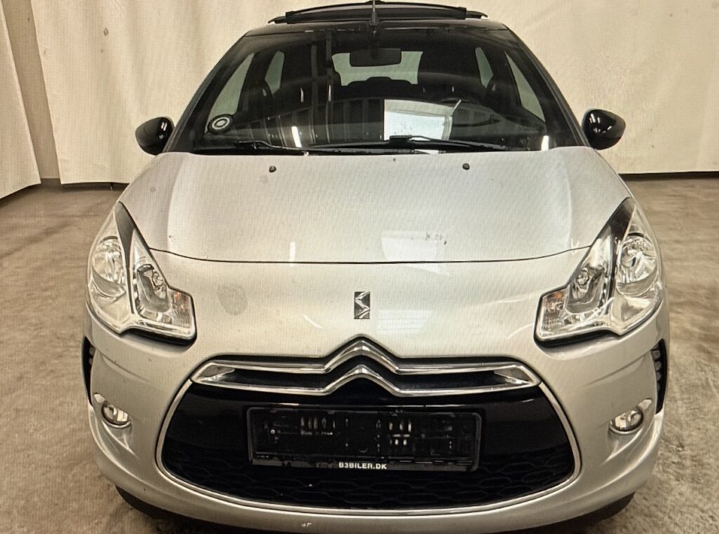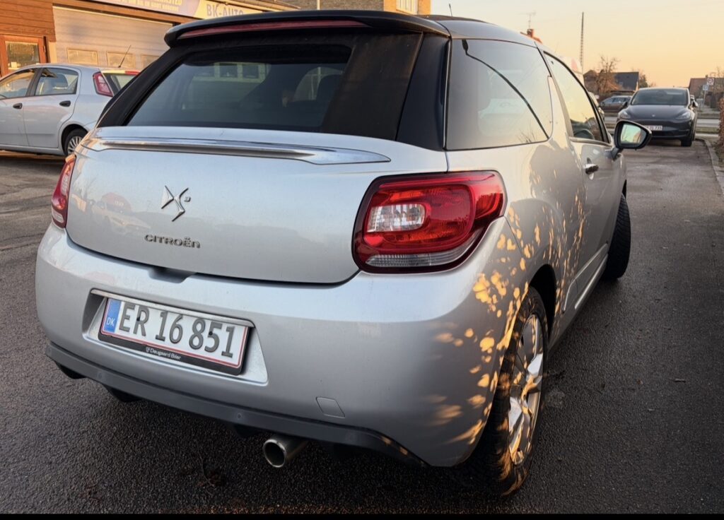 kørecomputer, mørk loftbeklædning, læderrat, tågelygter, aircondition, centrallås, udv. temp. måler, fjernb. centrallås, fartpilot, sædevarme, el-ruder, cd/radio, 6 airbags, esp, regnsensor, parkeringssensorCitroën DS3 Cabriolet 1.2 VTi 82 hk – Lav km – Flot stand Citroën DS3 Cabriolet fra 2014 med den økonomiske 1.2 benzinmotor og manuel gearkasse. Bilen har kun kørt 76.717 km og fremstår i pæn og velholdt stand. Cabriolet Benzin – 82 hk Lavt brændstofforbrug Manuelt gear Velegnet som både bybil og pendlerbil Bilen kører godt og er ideel til dig, der ønsker en smart og sporty cabriolet med lave ejeromkostninger.